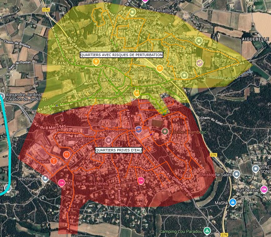 Vue globale des différents quartiers affectés par une coupure d’eau totale (en rouge) et par un risque de perturbations (en jaune).